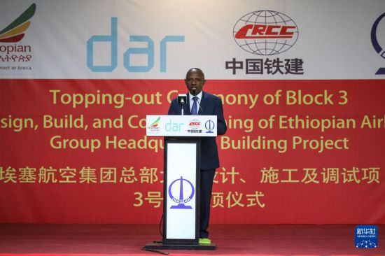 8月18日,在埃塞俄比亚首都亚的斯亚贝巴,埃塞俄比亚航空公司首席执行官梅斯芬·塔塞乌在该公司总部大楼项目主建筑封顶仪式上发言。新华社记者 韩旭 摄