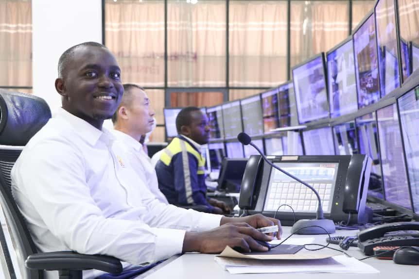 在蒙内铁路调度中心,本地调度员克林顿·奥巴雷与中国调度员张兴华共同进行列车调度指挥工作。非洲之星铁路运营有限责任公司供图