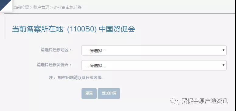 选择要迁移的地区发送申请(如在A市商务局完成备案的企业因特别原因不在A市贸促会申办原产地证书,提出将备案地迁移到B市贸促会的申请,申请需经A市贸促会与B市贸促会的同意。)
