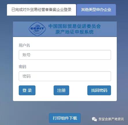 1.企业完成对外贸易经营者备案后,可登录贸促会原产地证申报系统http://qiye.ccpiteco.net