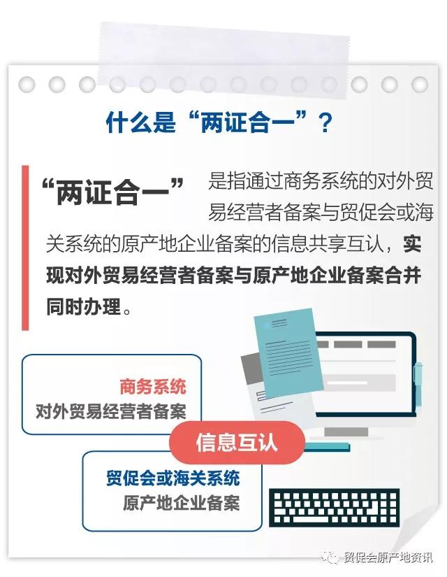 2019年10月15日,对外贸易经营者备案和原产地企业备案“两证合一”系统上线后,在商务部门完成对外贸易经营者备案的企业,同时即完成贸促会原产地企业备案,可直接向中国贸促会及其地方机构申办原产地证书。