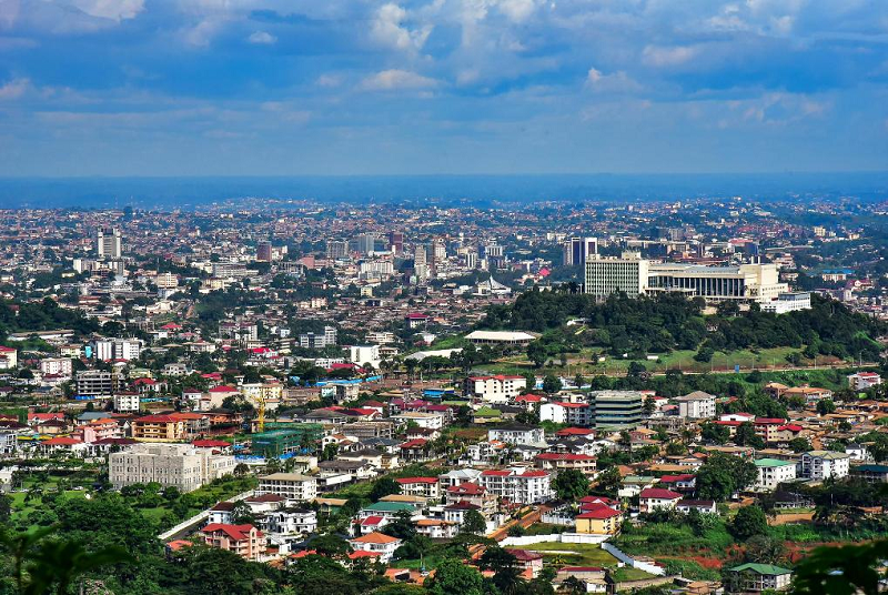 这是2019年5月29日在喀麦隆首都雅温得拍摄的雅温得会议大厦(山顶白色建筑)的资料照片。新华社发(科普索摄)