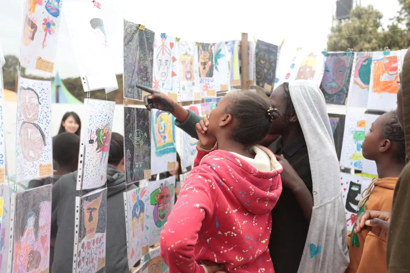 近800名当地儿童通过面具、编织、雕塑、绘画等多种形式,共同创作了本次主题艺术展。这些作品不仅是美的呈现,更是社区坚韧生命力的宣言。其中,一幅幅以火车为主题的绘画,是孩子们送给中国路桥“非洲之星”公益项目的一份特殊“礼物”,感谢其修建的蒙内铁路为当地带来的改变与希望。