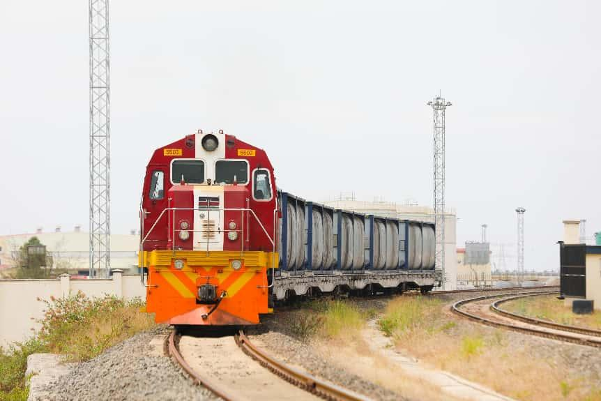 在蒙内铁路内罗毕终点站,一列货物列车行驶在铁路线上。非洲之星铁路运营有限责任公司供图