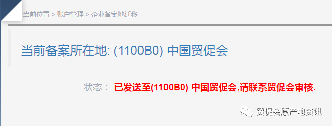 选择要迁移的地区发送申请(如在A市商务局完成备案的企业因特别原因不在A市贸促会申办原产地证书,提出将备案地迁移到B市贸促会的申请,申请需经A市贸促会与B市贸促会的同意。)