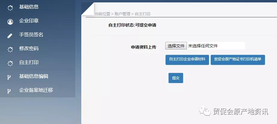 企业如申请贸促会原产地证书自主打印服务,可点击“自主打印申请”,查看“自主打印企业申请材料”和“贸促会原产地证书打印机清单”后,按要求上传申请资料,提交后等待贸促会审核。