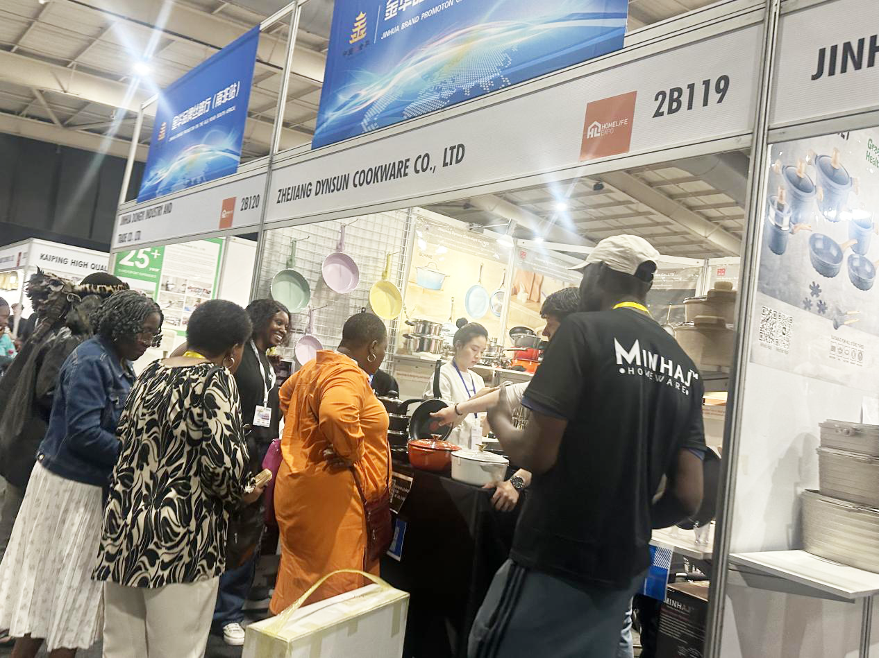 浙江鼎实厨业有限公司产品以不粘锅及各类锅具为主,展会首日便客流不断,四名业务员全程投入仍感人手紧张。总经理宋云霞介绍,公司产品以往长期销往欧美,此次试水南非市场,旨在拜访客户、拓展渠道,目前已对接精准客户50余位,确认订单4个柜。